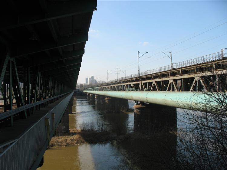 Jego budowa na początku XX wieku była koniecznością. Stojący obok (od 1875 roku) most kolejowy okazał się zbyt wąski i dlatego zdecydowano przeznaczyć go dla ruchu drogowego a pobudować dla pociągów nową przeprawę. Była gotowa w 1908 roku. Nie miała szczęścia ta konstrukcja. Już w 1915 roku zniszczyły ją wycofujące się przed Niemcami wojska rosyjskie. Co z tego, most rychło odbudowano, skoro w 1944 sytuacja się odwróciła i to właśnie Niemcy wycofywali się przed Rosjanami. Co zrobili z mostem? Też go wysadzili w powietrze. A Polacy? Polacy most odbudowali w 1946 roku. Choć w nie najlepszej kondycji stoi do dziś i służy w większości pociągom towarowym, tranzytem przejeżdżającym przez Warszawę. Ruch składów osobowych jest ograniczony do minimum. Jako ciekawostkę można podać, że most, podobnie jak jego sąsiad jest konstrukcją dwupoziomową. Jeszcze kilka lat temu można było przy odrobinie wprawy i dużej odwadze dostać się po zagiętej, pordzewiałej metalowej drabinie na dolny poziom, oficjalnie nieczynny. Potem czekało kilkaset metrów "spaceru” po spróchniałych deskach, czasami nawet miejscach bez desek, by z drugiej strony nie bez kłopotów dostać się na ląd. Emocje sięgały zenitu, gdy nad głowami przejeżdżał z niewyobrażalnym hukiem długi skład towarowy.(AniaiJurek)