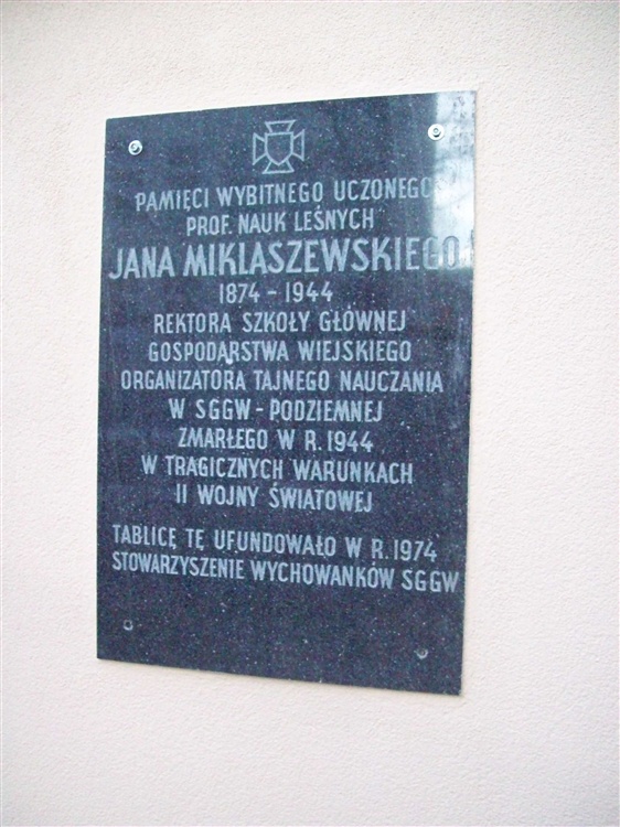 Tablica pamięci poświęcona jest wybitnemu uczonemu, profesorowi nauk leśnych, Janowi Miklaszewskiemu, który był rektorem Szkoły Głównej Gospodarstwa Wiejskiego, organizatorem tajnego nauczania w podziemnej SGGW. Zmarł tragicznie w czasie działań wojennych w 1944 roku. W 1974 roku tablica została umieszczona na elewacji kamienicy przy ulicy Kieleckiej 46 przez fundatorów - ze Stowarzyszenia Wychowanków SGGW.