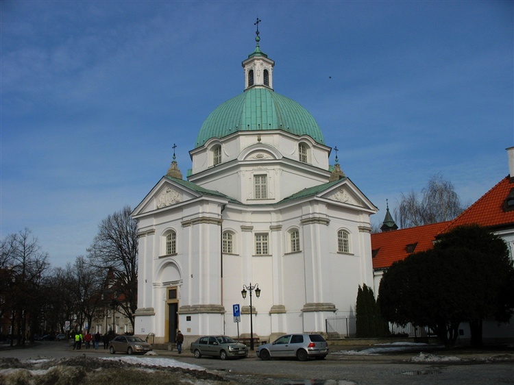 Budowla na planie krzyża greckiego, przykryta ośmioboczną kopułą z latarnią. W trójkątnym szczycie nad głównym wejściem znajdują się herby Sobieskich - Janina i Trzy Jelonki margrabiów de la Grange d'Arquien. Wnętrze zostało w trakcie odbudowy urządzone w sposób nowoczesny, co w przykry sposób kontrastuje z barokową architekturą świątyni.