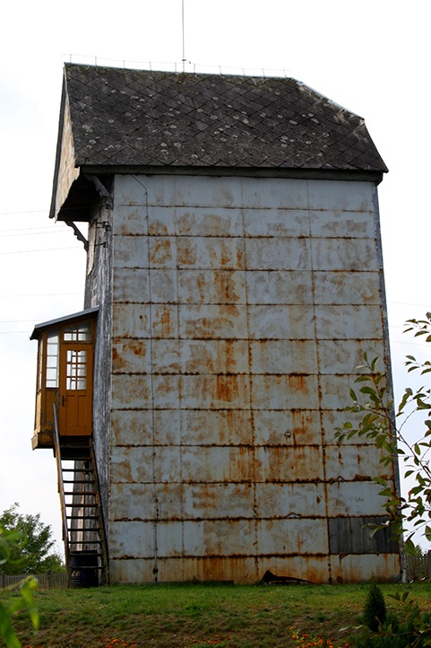 Drewniany wiatrak z 1 poł. XIX w. obity metalową blachą, stan dobry.