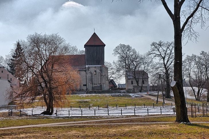 Kościół pw. Wszystkich Świętych wznoszono w połowie XV wieku, a budowę ukończono najprawdopodobniej w 1464 r. Murowana budowla zastąpiła zapewne drewnianego poprzednika. Gotycki, jednonawowy obiekt jest świątynią orientowaną charakterystyczną dla doby średniowiecza. Jego nawę nakrywa sklepienie gwiaździste, w którym widnieje kartusz z białą różą.