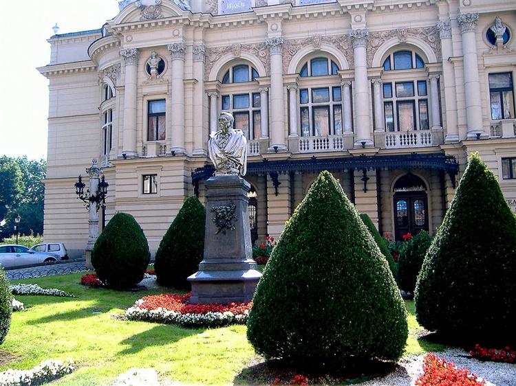 Skwer przed Teatrem im. Juliusza Słowackiego zdobi pomnik wybitnego komediopisarza Aleksandra hr. Fredry. Obelisk pochodzący z 1900 r. jest dziełem twórcy wielu polskich pomników rzeźbiarza Cypriana Godebskiego.