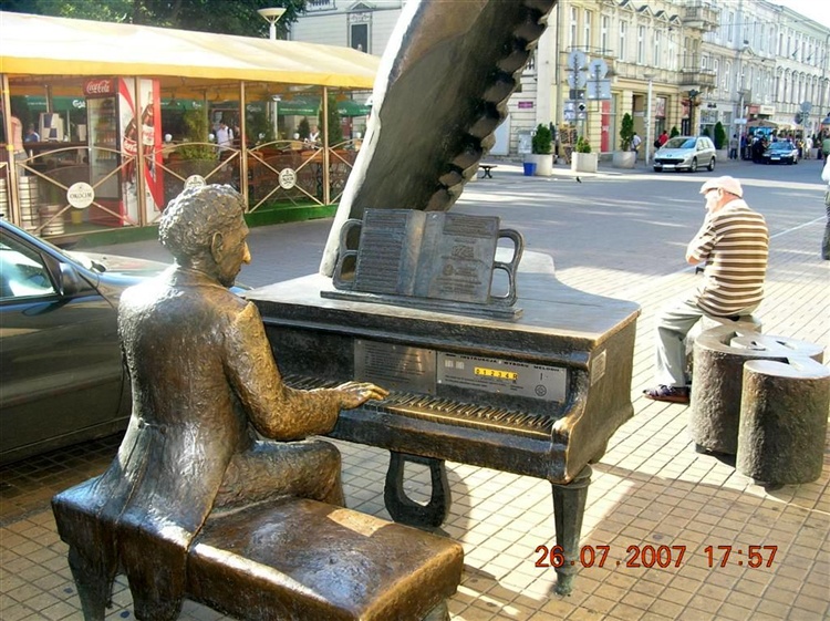 Pomnik powstał w 2000 roku z okazji Światowego Spotkania Łodzian. Przedstawia urodzonego w Łodzi, wybitnego pianistę pochodzenia żydowskiego Artura Rubinsteina, siedzącego przy fortepianie.