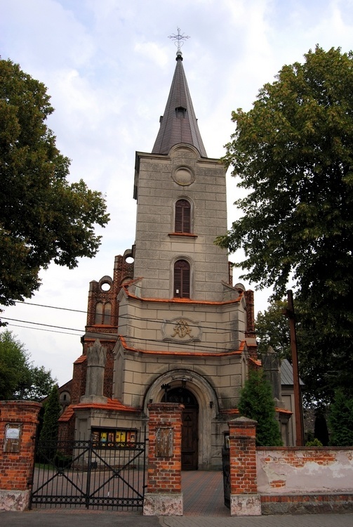 Kościół zbudowany ok. 1460 roku z fundacji Bartłomieja Gruszczyńskiego, ówczesnego właściciela wsi. W drugiej połowie XVII wieku dobudowano do niego barokową kaplicę, a w 1887 roku od zachodu neogotycką wieżę. Kościół został gruntownie przebudowany w latach 1929-1930. Wewnątrz kościoła mieszczą się cztery rokokowe ołtarze, a także gotycka chrzcielnica z ornamentem maswerkowym z 1460 roku, gotycka kropielnica z 1646 roku, jak również nagrobek Pawła Potworowskiego (zm. w 1595 roku) oraz jego żony (zmarłej rok po śmierci męża).