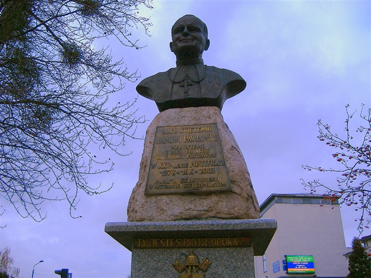 Nie ma w Polsce drugiej tak upamiętnionej osoby jak Jan Paweł II - papież Polak. Prawie w każdym mieście stanęły pomniki bądź zawisły tablice fundowane na różne okazje. W Ostrowie Wlkp. taką okazją stało się 25-lecie pontyfikatu. W 2003 r. odsłonięto obelisk w formie popiersia stojącego na wysokim cokole, na którym znalazł się napis oraz herb papieski. Pomnik można zobaczyć na małym placyku w pobliżu kościoła św. Antoniego.