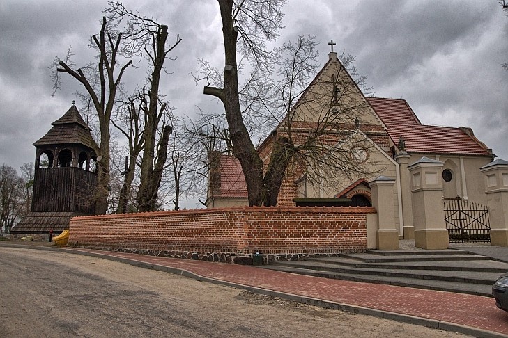 Zatopiona wśród drzew bryła gotyckiego kościoła najlepiej widoczna jest podczas bezlistnych pór roku. Świątynia (nieznanej fundacji) pochodzi z pierwszej połowy XVI w. Z całą pewnością została wybudowana w miejscu wcześniejszej, ponieważ pierwsza wzmianka o tutejszej parafii pochodzi już z 1298 r. Bryła kościoła zmieniała się przez wieki. Pierwotnie jednonawowa z transeptem, trójbocznie zamkniętym prezbiterium i gwiaździstym sklepieniem. W latach 1550-75 została powiększona o renesansową kaplicę grobową Potulickich. Dwa wieki później dobudowano kruchtę od strony zachodniej a po ponad stu latach – kolejną (neogotycką) od strony południowej (dziś pełni rolę głównego wejścia).