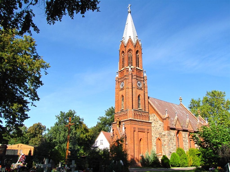 Kościół pw. Wniebowzięcia Najświętszej Maryi Panny wzniesiono w drugiej połowie XIII w. w stylu romańskim z kostki kamiennej. W latach 1873-76 dobudowano wieżę z cegły a w 1986 zakrystię. Na cmentarzu sąsiadującym ze świątynią znajdują się m.in. nagrobki rodziny von Finckenstein (zamożnego rodu hrabiowskiego z Prus Wschodnich). Świątynia ogrodzona jest murem kamienno-ceglanym z ozdobną bramą wjazdową.