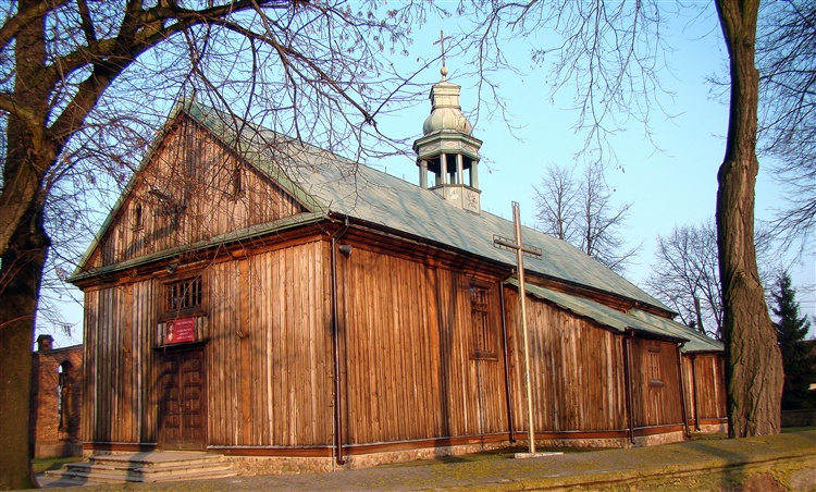 Orientowany, konstrukcji zrębowej, zewnątrz oszalowany z olistwowaniem. Zbudowany na otynkowanej ceglanej podmurówce, na rzucie prostokąta, z prezbiterium wydzielonym wewnątrz, zamkniętym ścianą prostą. Do nawy od południa dostawiona kruchta boczna, do prezbiterium od północy zakrystia, od południa kaplica zamknięta trójbocznie. Nad korpusem i prezbiterium wspólny dach dwuspadowy, nad kaplicą, zakrystią i kruchtą daszki pulpitowe, wszystkie kryte blachą. Pośrodku kalenicy ośmioboczna ażurowa wieżyczka na sygnaturkę, z cebulastym hełmem.