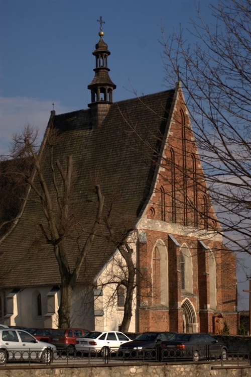 Kościół wzniesiono w 1355 r. w miejscu, gdzie stała starsza, drewniana świątynia. Sklepienie krzyżowe jest wsparte na dwóch filarach, stromy dach, typowy dla gotyku, pokryty gontem zwieńczony jest smukłą wieżyczką. Bryła kościoła z ceglanymi i tynkowanymi elewacjami, ozdobionymi przyporami i płycinami, wysoko góruje nad sylwetą miasta. Obok kościoła znajduje się dzwonnica, przebudowana w XVII w. z baszty obronnej. W 1944 r. w trakcie działań wojennych zniszczona została gotycka wikarówka, której ruiny podziwiać można nieopodal.