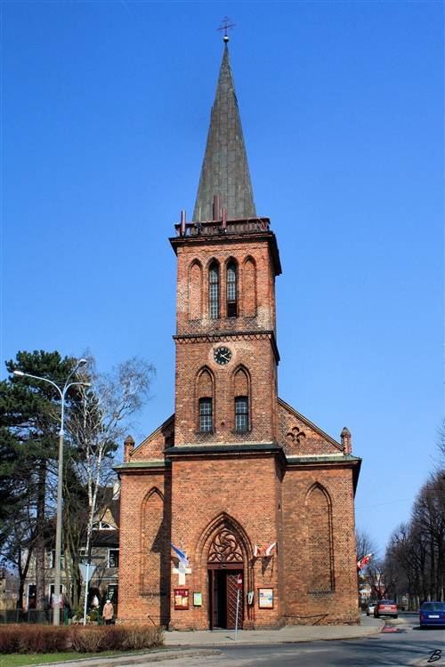 Jest to budowla murowana z czerwonej cegły, przykryta dwuspadowym dachem i posiadająca wieżę o wysokości 43 metrów zwieńczoną smukłym hełmem. Wnętrze pokrywa kunsztowne sklepienie, które tak, jak boczne galeryjki i empora organowa wsparte jest na ośmiu drewnianych kolumnach. Sklepienie jest pozorne - tzn. wykonane zostało z drewna pokrytego warstwą tynku ze zdobieniami.