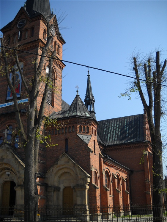 Kościół wybudowano w stylu neogotyckim z elementami romańskimi. Szczyty ścian transeptu zdobi siedem wnęk zakończonych kamiennymi sterczynami. W ścianach bocznych transeptu można dostrzec wąskie romańskie okienka. Estetykę kościoła podkreśla zastosowanie czerwonej cegły na przemian z czarno paloną zendrówką.