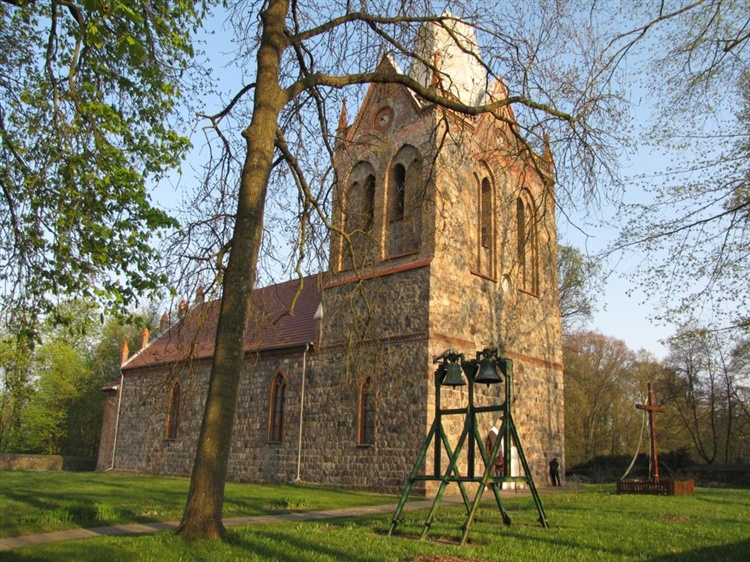 Kościół wzniesiono w drugiej połowie XIII w. z kostki granitowej. Jest jednonawowy z wieżą po zachodniej stronie. W XV w. wieżę nadbudowano i zwieńczono ośmiobocznym hełmem, natomiast w XIX w. cały kościół gruntownie przebudowano. We wnętrzu zwraca uwagę chrzcielnica z XVIII w. W murze otaczającym zabytek zachowała się gotycka brama z XV w.