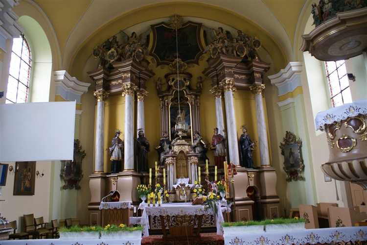 Kościół wzmiankowany w 1317 r. Obecny, barokowy wzniesiony został w latach 1754-57. Zabytek jest murowany, otynkowany, jednonawowy z czworoboczną wieżą od zachodu przykrytą cebulastym hełmem. Rokokowe wyposażenie wnętrz świątyni pochodzi z XVIII w.