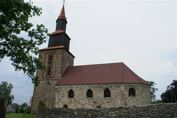 Kościół zbudowany został w XV wieku z głazów narzutowych; posiada wieżę zakończoną drewnianym hełmem z 1850 roku. Wewnątrz świątyni znajduje się późnogotycki ołtarz z krucyfiksem z XVI wieku oraz balustrada chóru z 1600 roku. Kościół wraz z dawnym cmentarzem przykościelnym otoczony jest kamiennym murem.
