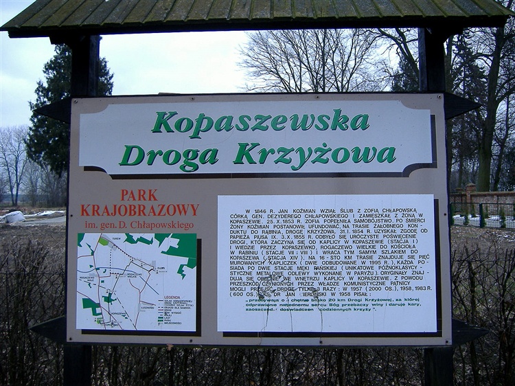 Między Kopaszewem i Rąbiniem przy skrzyżowaniach dróg stoją charakterystyczne pobielone kapliczki. Na każdej z nich znajdują się dwie płaskorzeźbione stacje Drogi Krzyżowej. Kapliczki zbudowano na polecenie Jana Koźmiana (1814-1877) po tym, jak jego żona Zofia - córka gen. Dezyderego Chłapowskiego - w 1853 r., pod wpływem rozstroju nerwowego odebrała sobie życie. Kapliczki postawiono wzdłuż 16-kilometrowej trasy, którą podążał kondukt żałobny, a Drogę Krzyżową tak pomyślano, by stacje od pierwszej do siódmej znajdowały się przy drodze z Kopaszewa do Rąbinia, a stacje od ósmej do czternastej - przy drodze powrotnej. Nieszczęsny wdowiec wiele razy odprawiał tu modły. Niepocieszony po stracie ukochanej, rozpoczął studia teologiczne. W wieku 46 lat przyjął święcenia kapłańskie. Oddał się działalności publicystycznej i charytatywnej, a nawet został kanonikiem kapituły poznańskiej.
