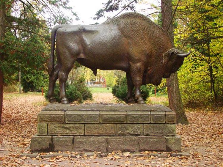 Odlany w Petersburgu w 1860 r. na życzenie cara Aleksandra II, miał upamiętniać huczne polowanie w Puszczy Białowieskiej, kiedy to sam monarcha ubił jednym strzałem wyjątkowego samca żubra. Posąg żubra naturalnej wielkości przez 53 lata stał w Puszczy Białowieskiej. W czasie I wojny światowej został wywieziony do Moskwy. Po wojnie oddany przez władze radzieckie trafił do Warszawy. W 1930 r. decyzją prezydenta Ignacego Mościckiego został przywieziony do Spały, gdzie stoi do dziś jako oryginalna atrakcja turystyczna, pełniąc rolę nieoficjalnego herbu Spały i oryginalnej atrakcji turystycznej.