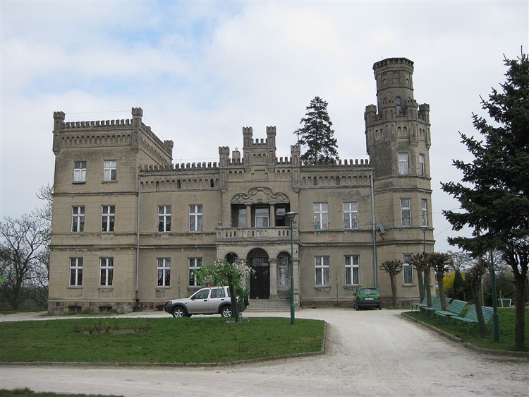 Na wysokiej skarpie opadającej do rynnowego Jeziora Kołdrąbskiego, stoi duży neogotycki dwór nazywany często pałacem, z racji wielkości i dwupiętrowych wież po bokach. Wybudowany został w latach 1870-1880 dla Antoniego Zawadzkiego. Dwór otacza mały park o powierzchni 2,7 ha założony w 2 poł. XIX w.