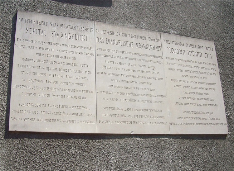 Na ścianie budynku przy ulicy Nowolipie 9/11 znajduje się kamienna tablica, która upamiętnia istnienie w tym miejscu Szpitala Ewangelickiego; na niej wyryty jest napis w trzech językach - polskim, hebrajskim i niemieckim, który brzmi: ” W tym miejscu stał w latach 1736-1943 SZPITAL EWANGELICKI. Był zawsze ostoją miłosierdzia, człowieczeństwa i wiary w czasach, kiedy spełniał się nazistowski wyrok zagłady. Wierny swej wiekowej misji, ratował ludność żydowską z ginącego getta. Tablica upamiętnia męstwo, dobro i uczciwość tych, którzy dochowali wierności Bogu i ludziom w najtrudniejszych chwilach wojny. Ufundowano ją ku czci bohaterstwa i wspólnoty w cierpieniu z Żydami, których świat nie potrafił ocalić”.