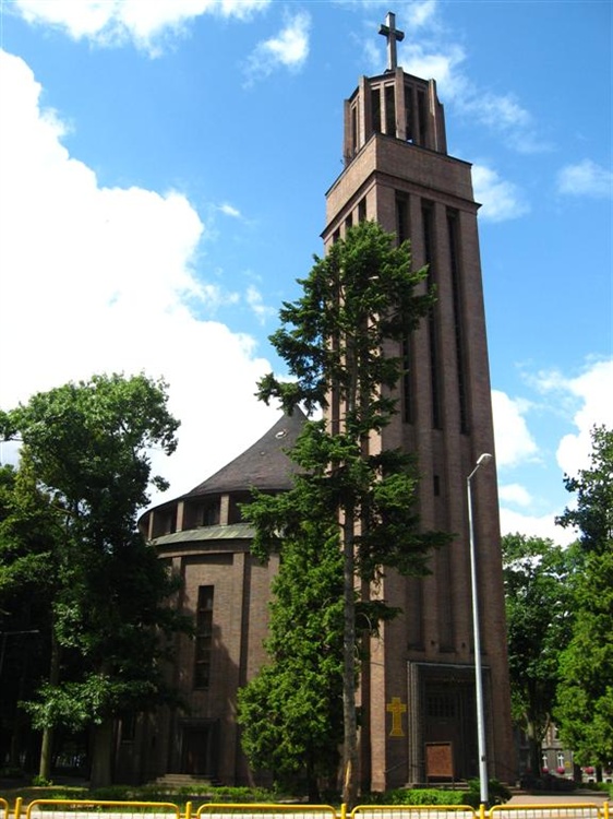 Modernistyczna budowla w formie klinkierowej rotundy z 1930 r. projektu Kurta Steinberga powstała jako ewangelicki kościół św. Marcina Lutra. Z okresu budowy zachowały się ławki i części organowe. W 1997 r. z okazji wizyty papieża Jana Pawła II w Polsce wykonano nowe witraże, duże okna w formie prostokątów pięknie rozświetlają wnętrze kościoła.