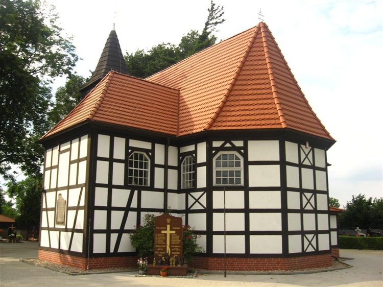 Drewniany kościół o konstrukcji szachulcowej z XVII w. z dobudowaną w XVIII w. wieżą. W XIX w. kościół był wielokrotnie niszczony w trakcie działań wojennych prowadzonych w tym rejonie zarówno przez oddziały napoleońskie jak i rosyjskie. Zabytek przeszedł remont i wymianę wyposażenia, na wieży kościoła zamontowano zegar.