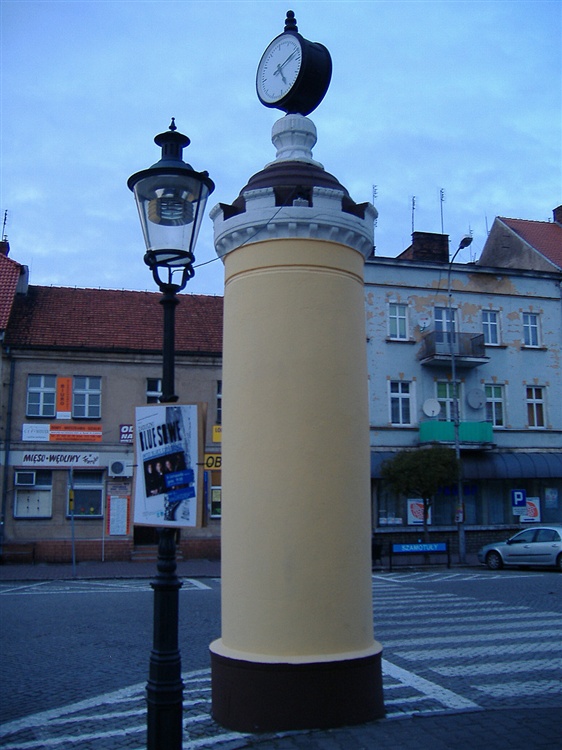 Najczęściej w miastach zegary montowano na wieżach ratuszowych lub kościelnych. Jednym z wyjątków są Szamotuły. Tutaj odmierzacz czasu zamontowano na słupie ogłoszeniowym znajdującym się w Rynku. Ciekawy obiekt stoi tu od XIX wieku, budząc zainteresowanie turystów.
