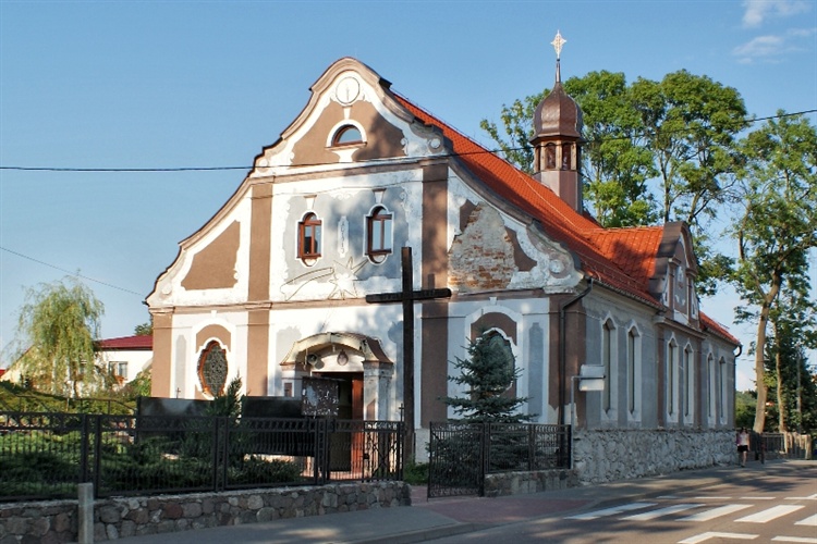 Budynek eklektyczny z 1913 roku. Jest to obiekt murowany z cegły. Część ścian jest w konstrukcji szkieletowej wypełnionej cegłą. Elewacja wschodnia posiada osie wydzielone malowanymi lizenami. W kalenicy umieszczona jest ośmioboczna sygnaturka - dzwonnica, zwieńczona hełmem z blachy miedzianej. Na belkowanym stropie można zobaczyć malowidła przedstawiające anioły i sceny z życia Jezusa.