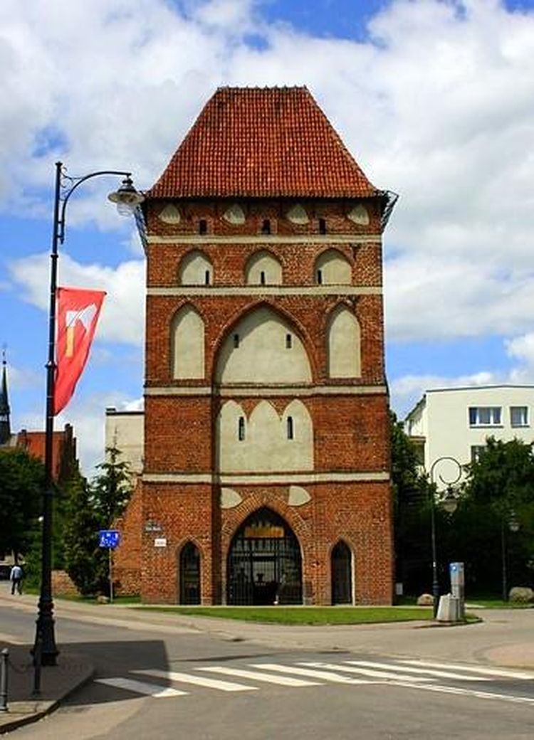 Brama pochodzi z XIV wieku, czyli tego samego okresu co umocnienia miejskie. Zwana była też Bramą Elbląską lub św. Ducha. Wzniesiona na planie prostokąta o wymiarach 7,5x9,5 m, ma 12 m wysokości. Jest pięciokondygnacyjna.