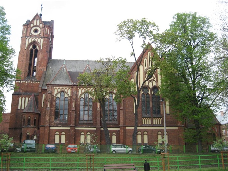 Neogotycki kościół, wzniesiony pod koniec XIX w. przez Augusta Menkena, pierwotnie był kościołem ewangelickim, w latach 50. przeszedł w ręce katolików. Budynek posiadał wysoką na 67 metrów wieżę. Podczas II wojny światowej kościół mocno ucierpiał, zabudowania kościelne i plebania zostały zniszczone, także neogotyckie wyposażenie. Odbudowany został po 1958 r. przez Księży Marianów, którzy władają kościołem do dnia dzisiejszego.