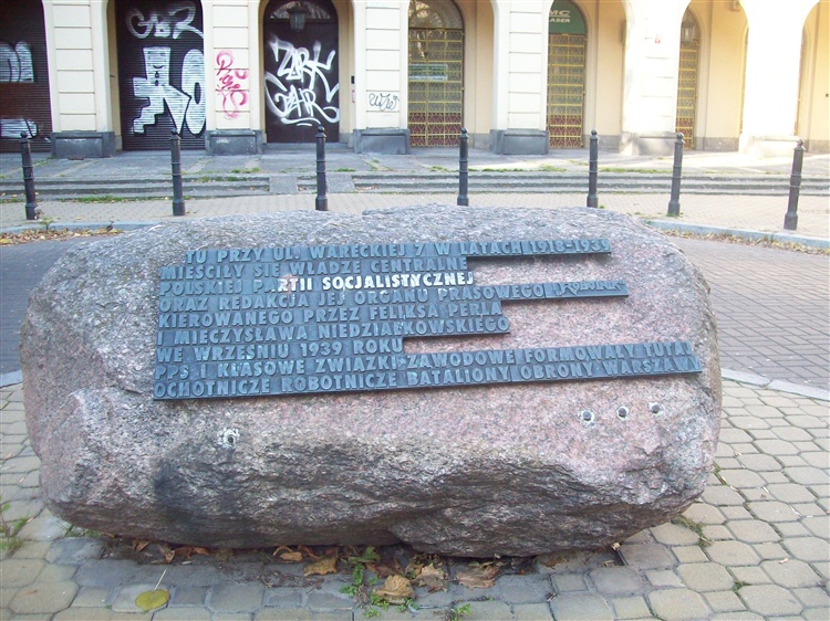 Pośrodku małego ronda na ulicy Wareckiej znajduje się głaz, który upamiętnia przedwojenną siedzibę PPS pod numerem 7. W tej już nieistniejącej kamienicy mieściły się władze centralne Polskiej Partii Socjalistycznej, redakcja organu prasowego „Robotnika” kierowanego przez Feliksa Perla i Mieczysława Niedziałkowskiego. Na głazie umieszczona jest tablica, na której wyryto napis: „Tu przy ulicy Wareckiej 7 w latach 1918-1939 mieściły się władze centralne Polskiej Partii Socjalistycznej oraz redakcja jej organu prasowego „Robotnik” kierowanego przez Feliksa Perla i Mieczysława Niedziałkowskiego. We wrześniu 1939 roku PPS i klasowe związki zawodowe formowały tutaj ochotnicze robotnicze bataliony obrony Warszawy”.