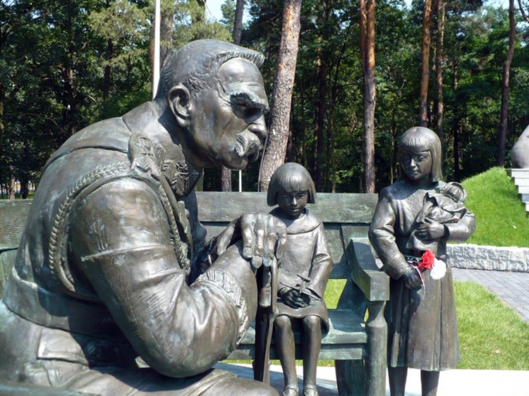 W 2009 roku zapadła decyzja o postawieniu na skwerze pomnika. W tym celu kopiec został przesunięty. Pomnik zaprojektował Karol Badyna. Przedstawia on marszałka siedzącego na krześle, w pełnym umundurowaniu. Obok znajdują się jego dwie córki: młodsza, Wanda siedzi na ławce, a starsza - Jadwiga stoi. Pomnik uroczyście odsłonięto 13 czerwca 2010 roku.