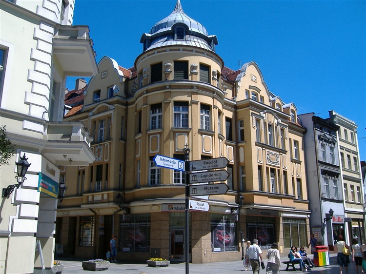 Narożnik dzisiejszych ulic Słowiańskiej i Grodzkiej zajmuje imponująca kamienica z 1910 r. nazywana Pod Niebieskim Lwem (niem. "Zum Blauen Loewen"). Charakterystyczny półokrągły narożnik nakryty hełmem był znakiem rozpoznawczym budynku. W pierwszej połowie XX w. mieścił reprezentacyjny sklep odzieżowy Kruger&Oberbeck. Obecnie w pięknie odnowionej kamienicy działa leszczyński oddział Banku Millennium.