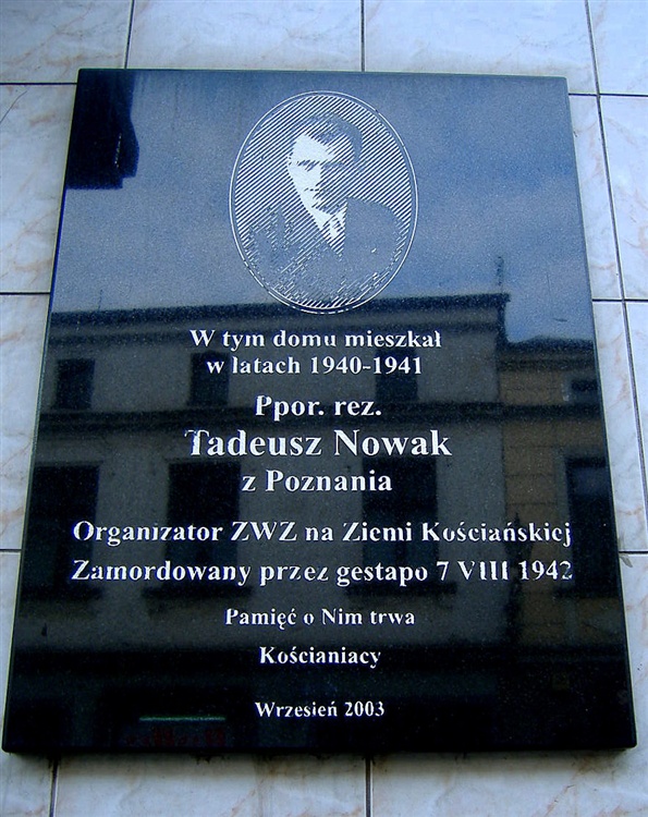 W latach 1940-1941 r. mieszkał w Kościanie oficer Związku Walki Zbrojnej ppor. Tadeusz Nowak z Poznania, oddelegowany w celu zorganizowania oddziału ZWZ na terenie Ziemi Kościańskiej. Aresztowany przez Gestapo został zamordowany 7 sierpnia 1942 r. Na kamienicy przy ulicy Piłsudskiego, w której mieszkał, wmurowano w 2003 r. pamiątkową tablicę z napisem "Pamięć o Nim trwa - Kościaniacy".