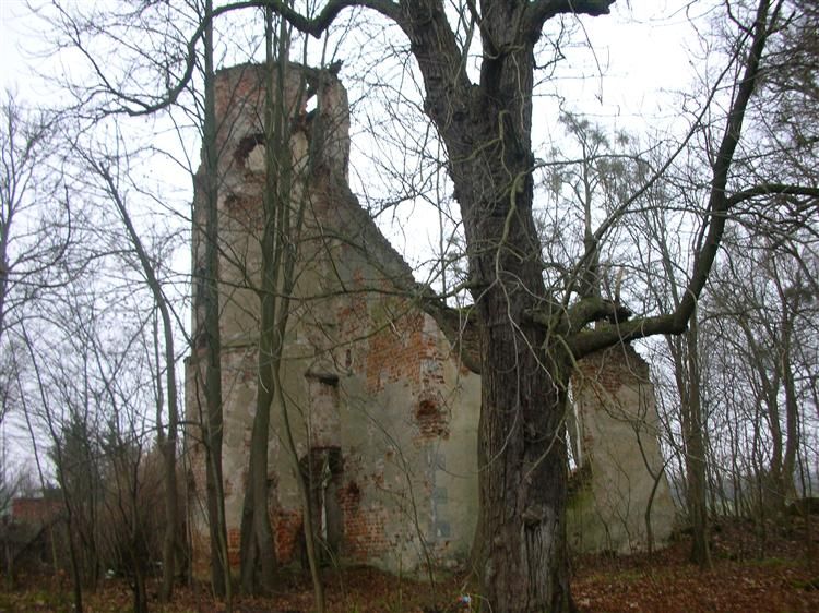 Bardziej interesującą budowlą jest jednak kaplica dworska z lat 1623-26, której majestatyczna ruina stoi przy dawnym wjeździe na dziedziniec. Czas nie obszedł się łaskawie z tym budynkiem, chociaż i tak znajduje się on w o wiele lepszym stanie niż sam pałac, którego po prostu już nie ma (wzniesiony w latach 1713-15, całkowicie zdewastowany po 1945 r.). W chwili obecnej kaplica niszczeje, ale przy zachowaniu elementarnych środków ostrożności można ją zwiedzić. Wewnątrz, niestety nie zachowały się jakiekolwiek elementy jej wyposażenia, a wejście na zrujnowaną wieżę jest w zasadzie niemożliwe.