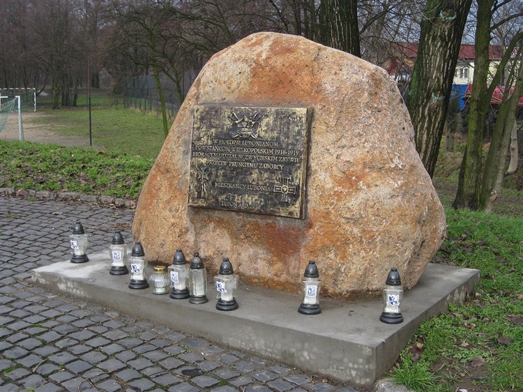 Na skwerze przy ul. Powstańców Wielkopolskich, z prawej strony Krzyża Milenijnego znajduje się okazały głaz z wmontowaną tablicą poświęconą Powstańcom Wielkopolskim - mieszkańcom Lubonia. Inicjatorami uhonorowania ich byli członkowie Stowarzyszenia Kulturalno-Oświatowego Forum Lubońskie, a projektantem i wykonawcą tablicy artysta plastyk Krzysztof Urban.