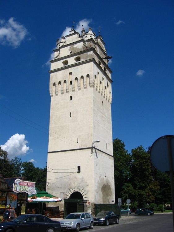 Zabytkowa, ponad 30-metrowa wieża zbudowana w XIV w. była połączona z murami obronnymi. Na przestrzeni wieków mury wokół wieży rozebrano, a sama wieża była wielokrotnie przebudowywana, m.in. została podwyższona i ozdobiona pięknym szczytem w formie krenelażu oraz renesansowym portalem jednej z kamienic z rynku.