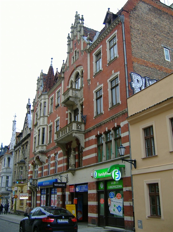 W 1904 r., przy ulicy św. Katarzyny 4 zbudowana została eklektyczna kamienica dla toruńskiego drukarza K. Domborowskiego. Właściciel budynku, którego pasją było drukarstwo zlecił umieszczenie w fasadzie naturalnej wielkości figury wynalazcy druku - Jana Gutenberga. Zdobienie fasady uzupełniają płaskorzeźby ze scenami przedstawiającymi pracę drukarzy. W kamienicy, w okresie międzywojennym wydawano dziennik "Słowo Pomorskie". Po wojnie mieściły się tutaj Zakłady Graficzne.