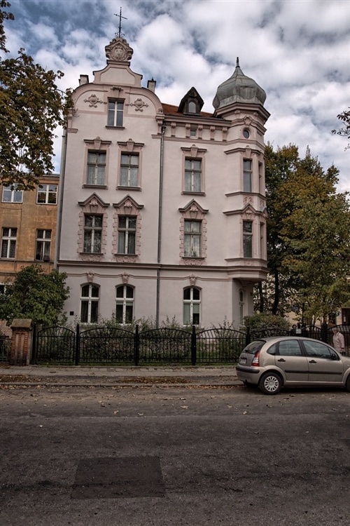 Eklektyczna kamienica z końca XIX w. z bogato zdobionymi elewacjami zaopatrzonymi w szczyty.