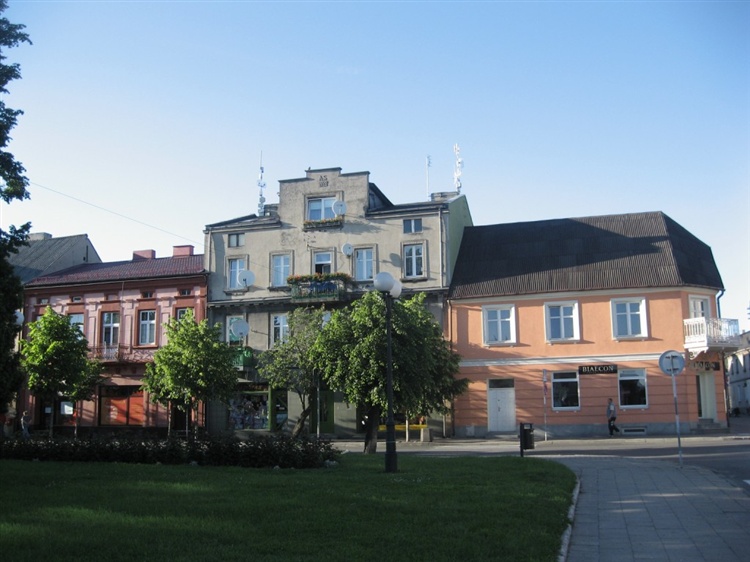 Rynek w Słupcy z pomnikiem Poległych za Wolność Ojczyzny. Plac otaczają zabytkowe kamienice z przełomu XIX i XX wieku.
