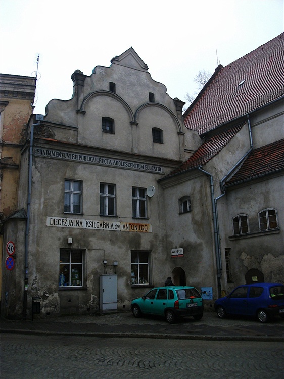 Wschowscy ewangelicy w 1607 r. odkupili od miejscowego szewca Georga Herberga kamienicę stojącą przy obecnej ulicy Powstańców Wielkopolskich 12. W przebudowanym budynku otworzyli szkołę dla swoich dzieci. Fasadę szkoły ozdobiono napisem "FUNDAMENTUM REI REPUBLICAE RECTA ADLESCENTIUM EDUCATIO" co w języku polskim brzmi "Fundamentem Rzeczypospolitej właściwe wychowanie młodzieży". Obecnie w budynku ma siedzibę Księgarnia Diecezjalna Św. Antoniego.