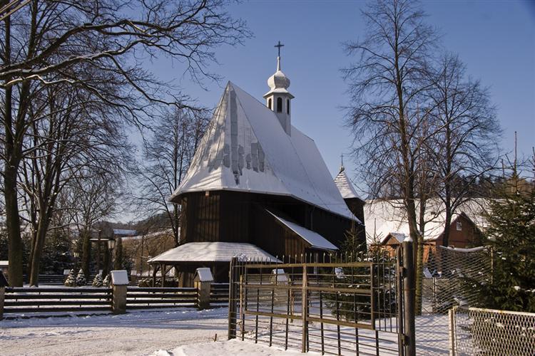 Kościół pw. św. Mikołaja z XVI w. orientowany, drewniany, konstrukcji zrębowej, oszalowany. Jednonawowy, z węższym, zamkniętym trójbocznie prezbiterium, do którego dobudowana jest zakrystia. Od frontu niewielki przedsionek konstrukcji szkieletowej. Dach dwuspadowy, stromy, jednokalenicowy, z wydatnym okapem, pokryty blachą. Na kalenicy wieloboczna wieżyczka, zwieńczona kopułką. Wnętrze nakrywa pozorne sklepienie kolebkowe.