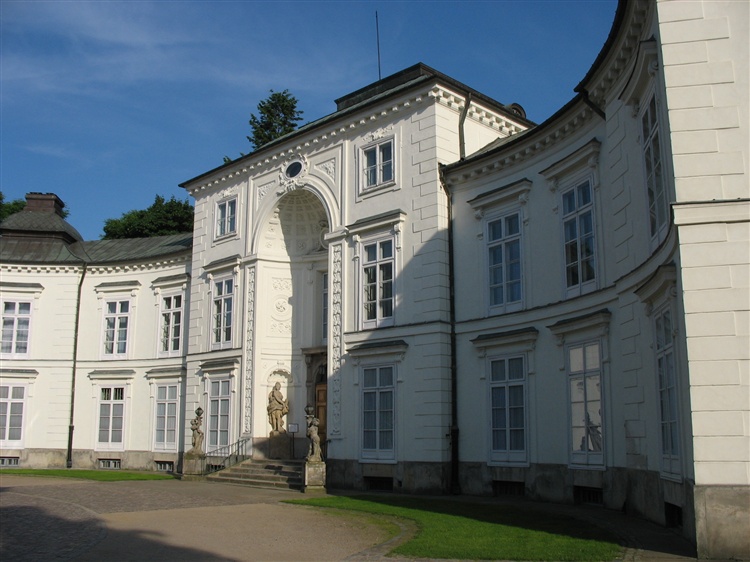Korpus pałacu o trzech kondygnacjach ma biegnącą przez całą jego wysokość niszę wejściową i jest ujęty w ćwierćkoliste skrzydła. Fasadę zdobi ogromna muszla z rzeźbami Jakuba Monaldiego, przedstawiającymi Zefira i Florę. Łagodne wygięcia dachów nawiązują do popularnych wtedy wzorów chińskich. Ocalałe wnętrza pałacu zdobią malowidła Jana Bogumiła Plerscha i Antoniego Gerżabka oraz dekoracje stiukowe i rzeźbiarskie.
