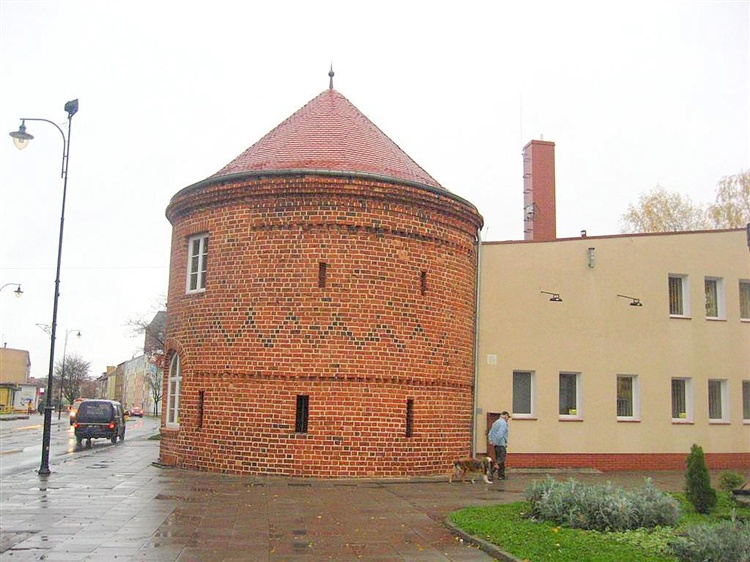 Fragmenty murów miejskich (XIV/XV w.): barbakan Bramy Kamiennej (XIV-XV w., odbudowany). Miasto powstało około 1291 r. Na początku jego granice były otoczone drewniana palisadą z 2 bramami od wschodu i zachodu. W I ćwierci XIV wieku miasto zostało powiększone i wtedy właśnie zastąpiono drewno - kamieniem granitowym i cegłą, z przewagą tej ostatniej. Po zakończeniu prac długość całkowita murów wynosiła 1600m, a na nich wznosiło się 7 baszt oraz 36 czatowni. Oprócz murów miasta strzegły fosy i podwójne wały ziemne. Miasto otwierały 3 Bramy: Kamienna, Wysoka oraz Młyńska. W XV i XVI wieku mury obronne zostały rozbudowane i pojawiły się mosty zwodzone, a wysokość murów wynosiła 8 metrów. Od początku XVIII wieku zaczęto likwidację umocnień. Na początku XIX wieku rozebrano bramy, a z czasem do szczątków murów obronnych zaczęły się dobudowywać domy, oficyny,i budynki gospodarcze. W II połowie XIX w. na miejscu dawnej fosy (w części N-W oraz S), która została wyrównana, powstał park wraz z alejkami spacerowymi.