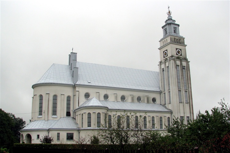 Dwa kościoły drewniane istniejące wcześniej w tym miejscu spłonęły. Pierwszy w roku 1872 od niezgaszonej świecy, drugi w 1944 roku w wyniku ostrzelania przez wojska niemieckie. Obecną świątynię murowaną wybudowano ze składek parafian i darowizn Polonii Amerykańskiej w latach 1958 - 1960. Kościół wybudowano w stylu nawiązującym do gotyku angielskiego. Konsekracji kościoła dokonał bp Stanisław Jakiel.