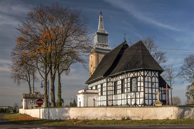 Szachulcowy, drewniany kościół konstrukcji słupowo-ramowej zbudowany został w XVII w., rozbudowany w XIX w., Wówczas, m.in. został poszerzony o nową murowaną wieżę. W wyposażeniu znajduje się barokowy ołtarz główny z XVIII w., barokowa chrzcielnica oraz ołtarze boczne, znajdują się tutaj także późnogotyckie i barokowe rzeźby. Przy kościele znajdują się także zabytkowe nagrobki z XIX w.