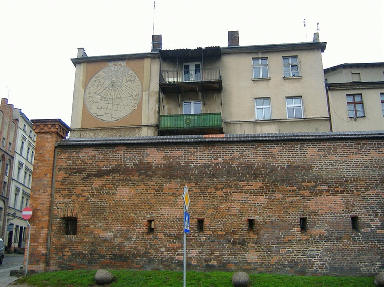 Na fasadzie budynku przy ulicy Łaziennej 2, od strony Bulwaru Filadelfijskiego, znajduje się zegar słoneczny, wykonany w 1965 r. przez Lecha Popielowskiego. Zegar umieszczony jest na wysokości 6 metrów i ma wymiary 4 x 4 m. Na tarczy zegara znajdują się godziny arabskie, znaki zodiaku oraz napis THORVNIVM. Zegar ten jest jednym z kilku toruńskich zegarów słonecznych.