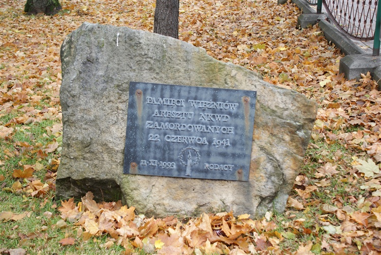 Pamiątkowa tablica znajduje się w parku obok budynku Zarządu Wodnego, który w 1939 roku zajęły radzieckie wojska pograniczne NKWD. Obok budynku postawiono barak, w którym trzymano więźniów. Więżniów rozstrzelano 22 czerwca 1941 roku - w dniu ataku Niemiec na Związek Radziecki. Tablicę odsłonięto w 1993 roku.