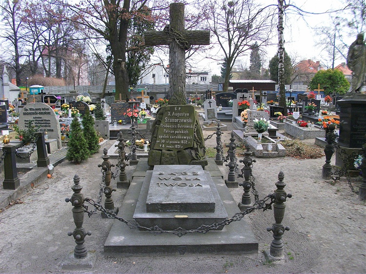 Ksiądz Augustyn Szamarzewski (1832-1891) był zasłużonym dla Wielkopolski działaczem społecznym i gospodarczym. Aktywnie wspierał powstańców styczniowych 1863 r., za co został skazany przez władze pruskie na karę więzienia, którą odbywał w Poznaniu i Berlinie. Po powrocie zajął się organizowaniem spółdzielni oszczędnościowo-kredytowych - najpierw w Środzie Wielkopolskiej, a potem w innych miastach Wielkopolski. Założone organizacje połączyły się w Związek Spółek Zarobkowych i Gospodarczych, a ksiądz Szamarzewski został ich patronem. Duchowny był jeszcze raz aresztowany w 1873 r. za aktywne przeciwstawianie się polityce germanizacji. Jego pogrzeb w Ostrowie w 1891 r. stał się wielką manifestacją patriotyczną. Grób zasłużonego Wielkopolanina znajduje się na Starym Cmentarzu przy Placu Bankowym.