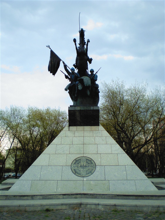 Pomnik znajduje się na Żoliborzu, w pobliżu placu Grunwaldzkiego, na skwerze po drugiej stronie ulicy Popiełuszki, między jednokierunkowymi jezdniami Alei Wojska Polskiego. Zwany jest także „pomnikiem Hallerczyków”. Upamiętnia udział Polonii amerykańskiej w odzyskaniu przez Polskę niepodległości, tj. dostarczenie przez Polonię amerykańską z USA i Kanady 20 tysięcy ochotników do Błękitnej Armii gen. Hallera. Po zakończeniu walk za ocean wróciło około 14,5 tysiąca żołnierzy. Monument odsłonięty został w dniu 14 sierpnia 1998 roku, czyli w przeddzień 78. rocznicy „Cudu nad Wisłą”, a zarazem Święta Wojska Polskiego. Autorami pomnika byli: projekt - mgr inż. Architekt Baltazar Brukalski, wykonanie - Andrzej Pityński z Nowego Jorku.