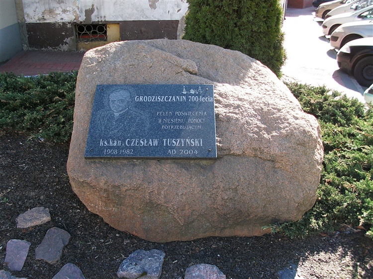 Na niewielkim placyku u zbiegu ulic Kościelnej i Tuszyńskiego w 2004 r. odsłonięto głaz pamiątkowy poświęcony księdzu Czesławowi Tuszyńskiemu (1908-1982). Ksiądz obdarzony tytułem Grodziszczanina 700-lecia zawsze służył pomocą potrzebującym, czym zasłużył sobie na pamięć i szacunek mieszkańców miasta. W czasie wojny mieszkał w dawnym szpitalu - przytułku przy kościele św. Ducha, w którym odprawiał msze dla polskich mieszkańców.