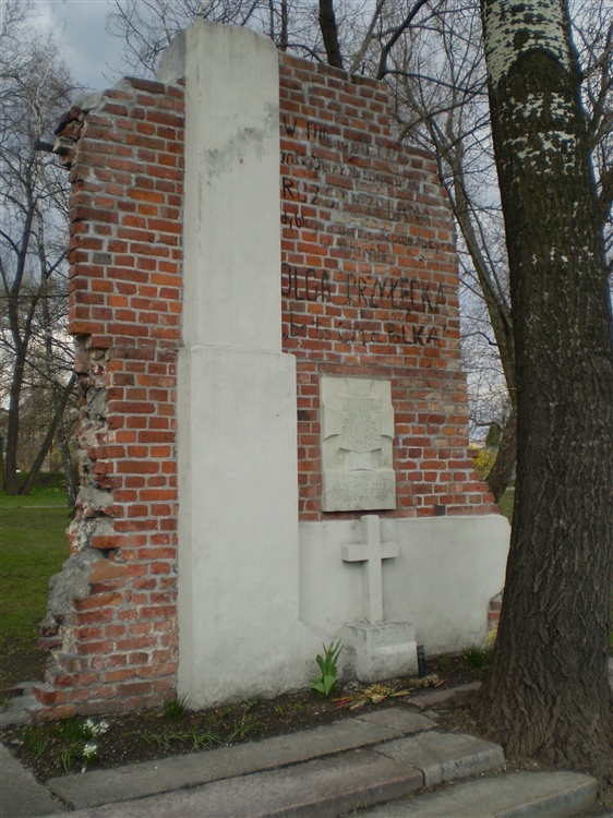 W centralnej części parku znajduje się fragment muru z tablicą: Miejsce uświęcone krwią Polaków poległych za wolność Ojczyzny. W tym miejscu 14 wrzesnia1944 r. hitlerowcy rozstrzelali 40 osób cywilnych. Na tym samym murze, nad kamienną tablicą, napis czarną farbą: 14 IX 1944. W tym miejscu została przez Niemców rozstrzelana, gdy błagała o litość dla pozostałych w schronie, Olga Przyłęcka. Bo to była Polka.